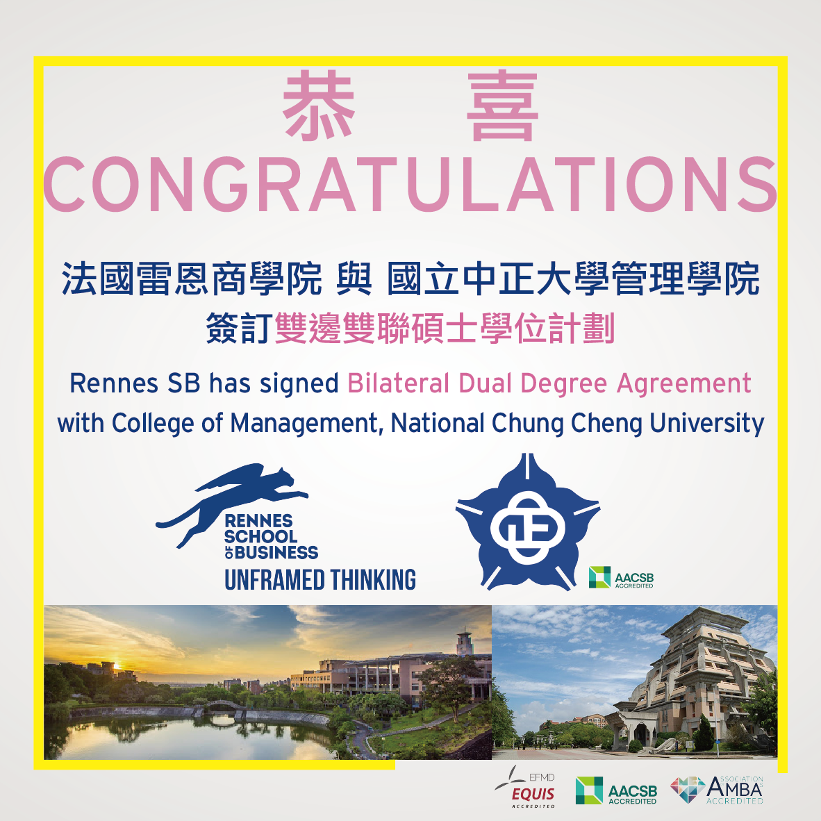 雷恩商學院自2016年起與 國立中正大學管理學院 簽署〈院際合作框架協議書〉,