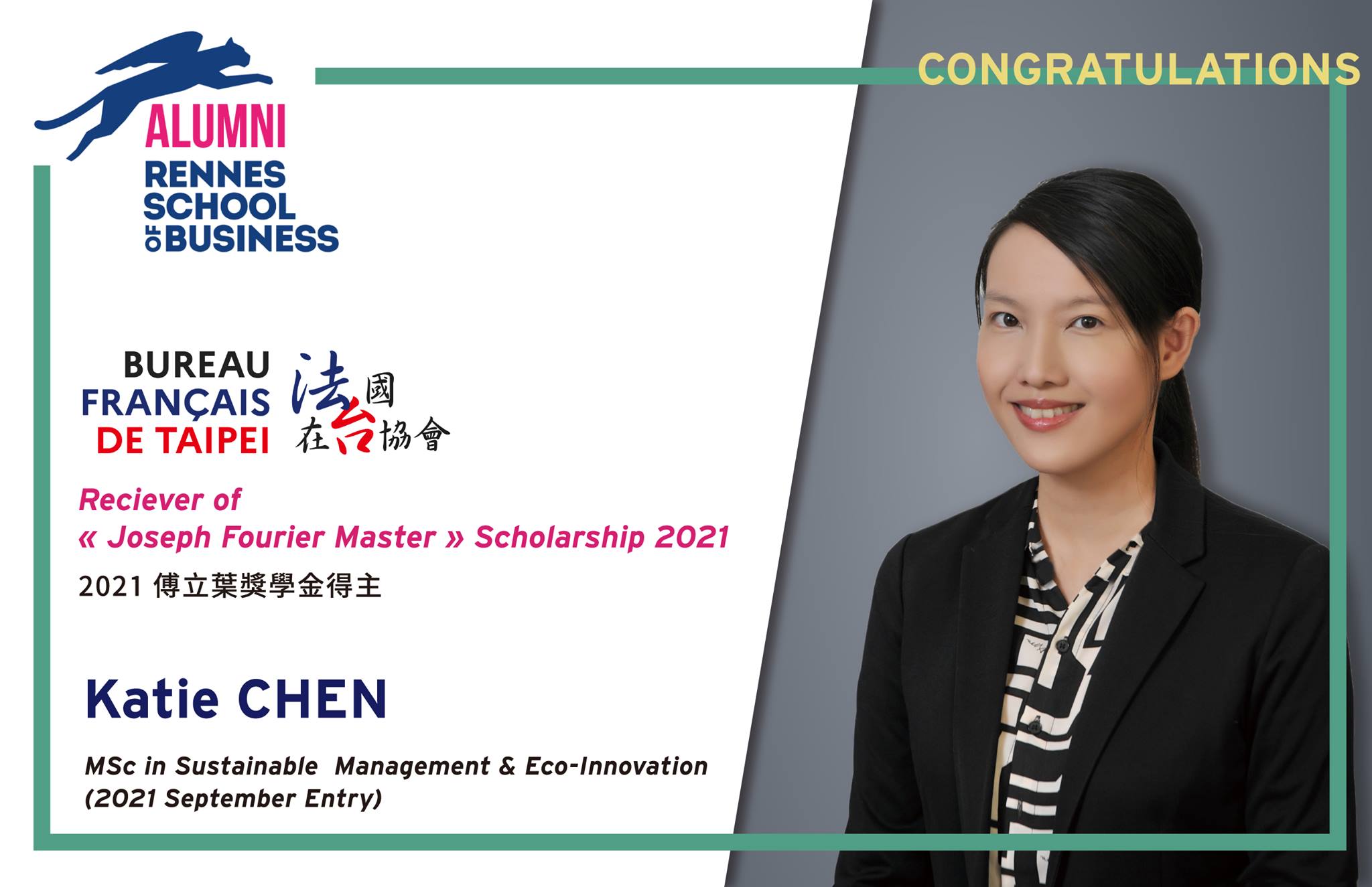 雷恩商學院臺灣校友會在此恭喜本屆錄取本校永續發展與生態創新管理學系陳郁姍(Katie)同學榮獲「2021傅立葉獎學金」,