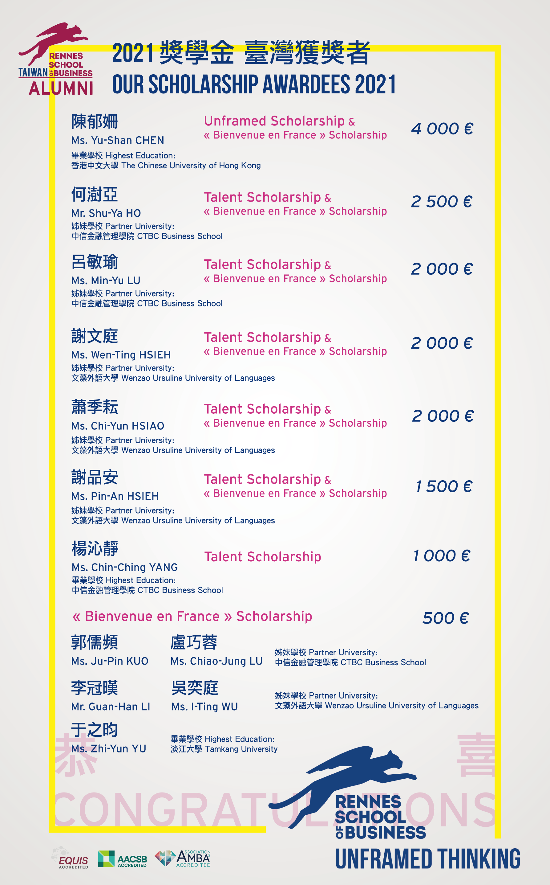 雷恩商學院臺灣校友會榮幸且驕傲的宣布此次2021年即將於秋季入學的獎學金受獎人。